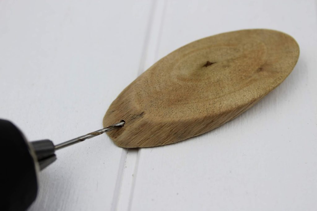 Macht auf der einen Seite ein kleines Loch mit Hilfe eures Akkuschraubers und eines Holzbohrers. Der Holzbohrer sollte in etwa das Maß von den Schraubhaken haben.