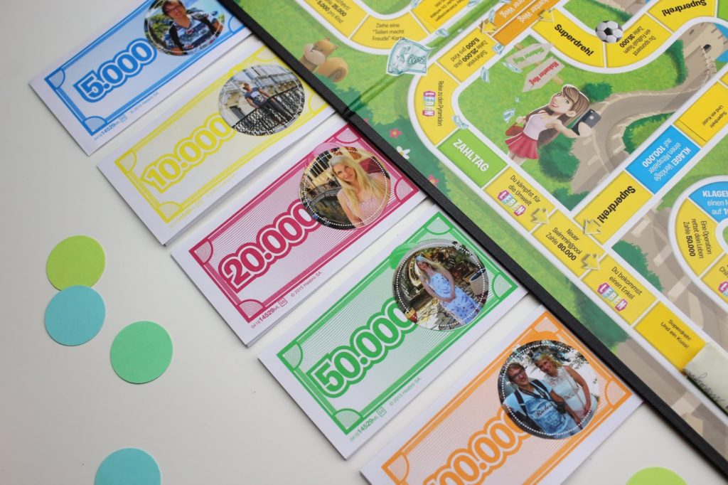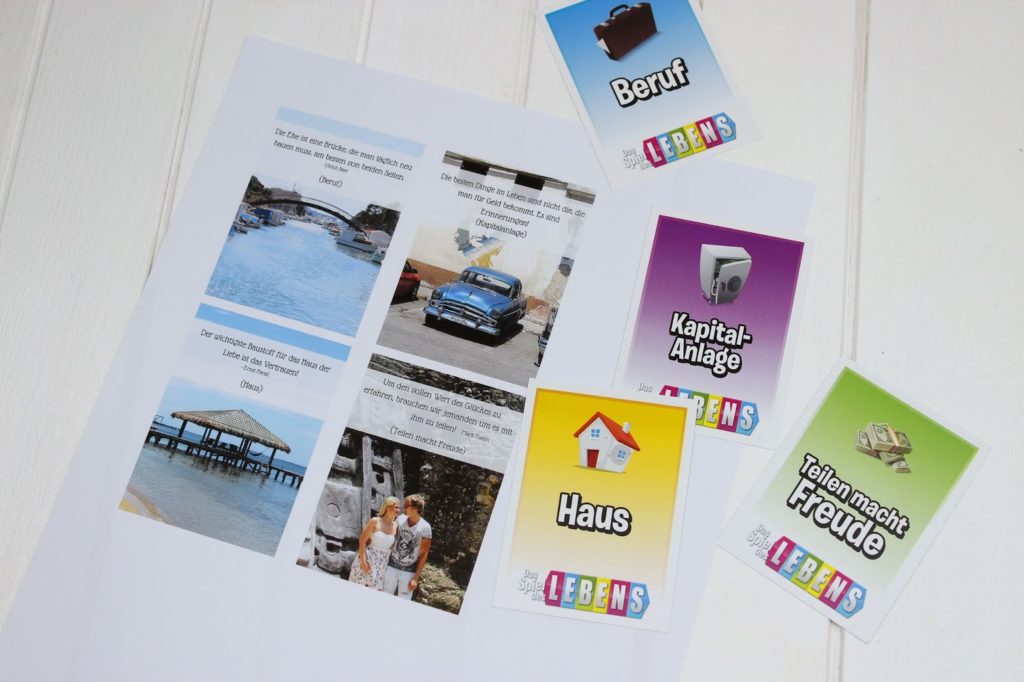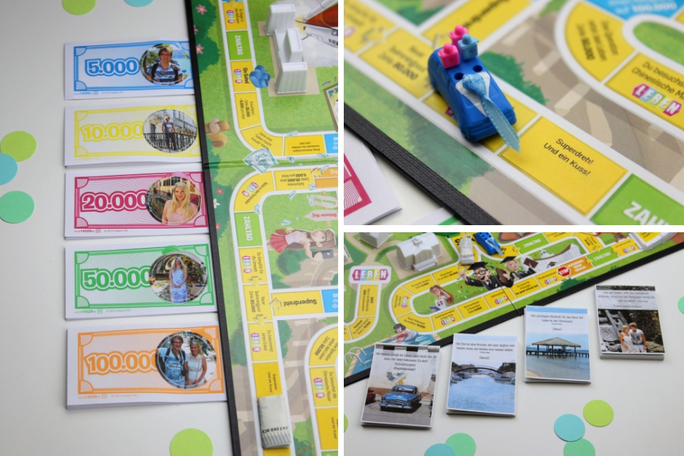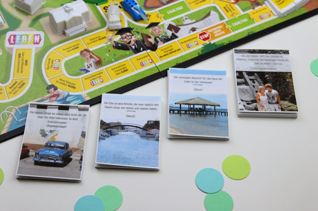 Wer sein Spiel des Lebens als Geldgeschenk umarbeiten will, kann auf die Zahltag Felder noch Geldscheine kleben. Denn was braucht ein Brautpaar mehr als Geld, so eine Hochzeit ist ziemlich teuer. Ich spreche da ja gerade aus Erfahrung. 🙂