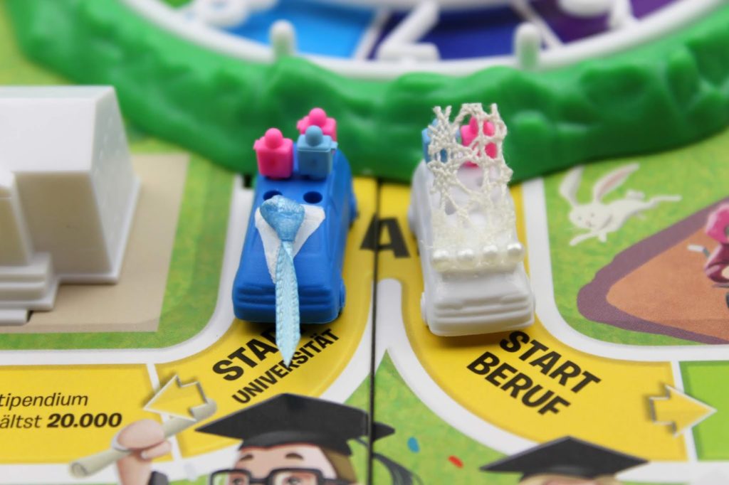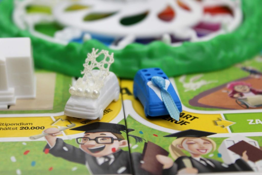 Die Spielfiguren beim Spiel des Lebens sind kleine Autos. Das passt perfekt, denn diese kann man schnell und einfach umarbeiten.