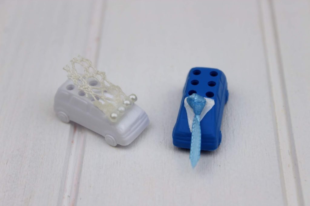 Das Brautauto wird natürlich das weiße. Wie soll es auch anders sein! 🙂 Damit es auch aussieht wie die Spielfigur der Braut, klebt etwas Spitzenband und ein paar Perlen an das Dach des Autos. Ich habe Sekundenkleber verwendet.
