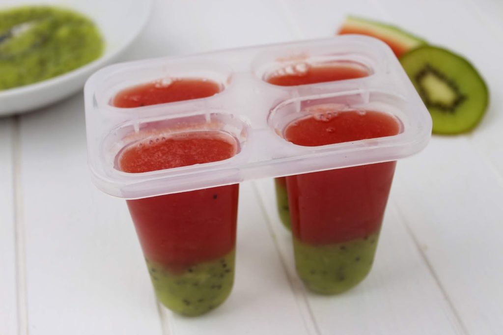 3. Gebt die Eisform jetzt für ca. 1 Stunde in die Tiefkühltruhe, damit die Kiwischicht schon gefrieren kann, ansonsten verlaufen später die beiden Schichten.