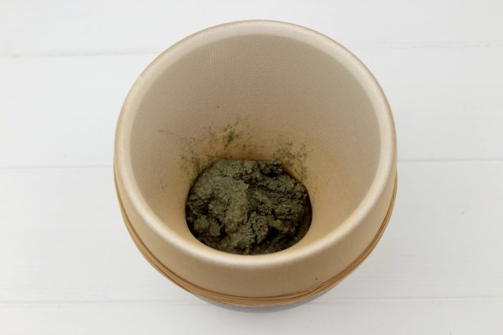 5. Nehmt den Strumpf dann ab und klopft die Masse auf einen festen Untergrund. So rutscht alles den Strumpf runter und die Blasen verschwinden. Hier wird es dann so richtig matschig. Wenn ihr die Möglichkeit habt, geht dafür lieber raus.