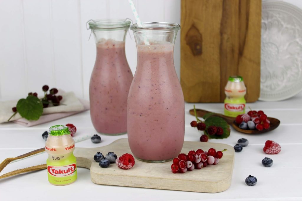 Das Rezept ist total einfach. Gebt zwei Yakult, jede Menge Obst und Milch in euren Mixer und mixt alles kräftig durch. Ihr könnt entweder frisches oder auch tiefgekühltes Obst verwenden. Wer es etwas süßer mag, kann auch noch etwas Apfelsaft mit dazu geben.