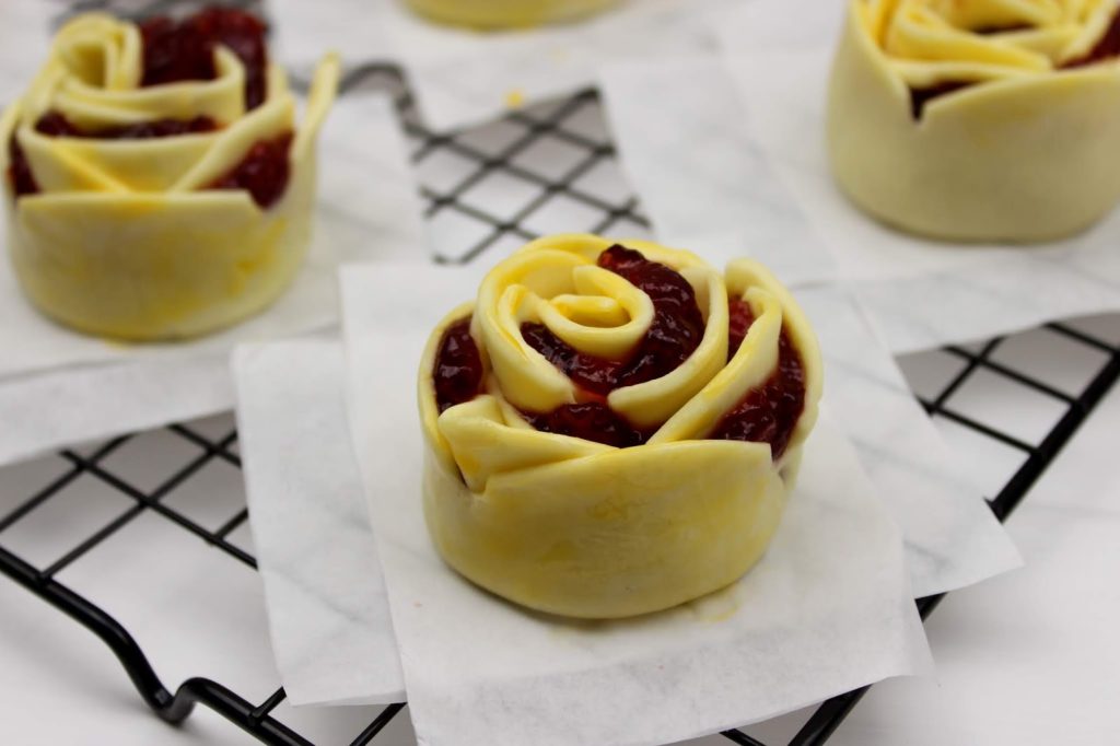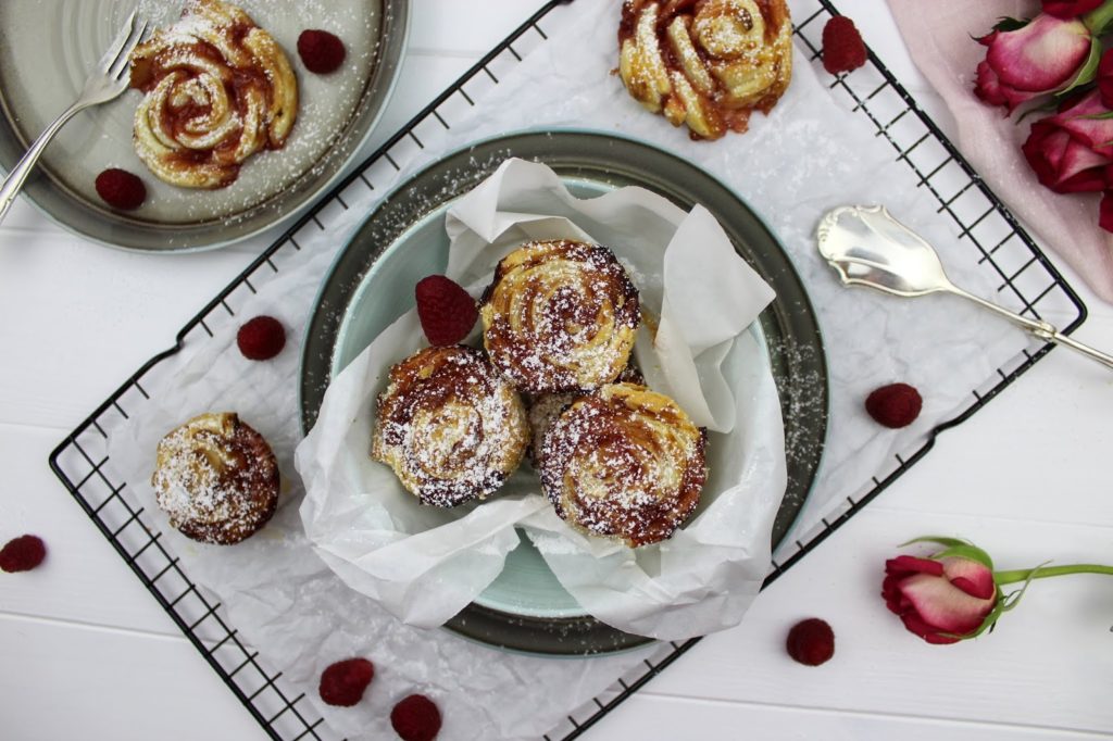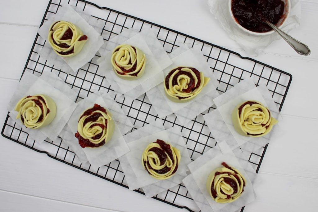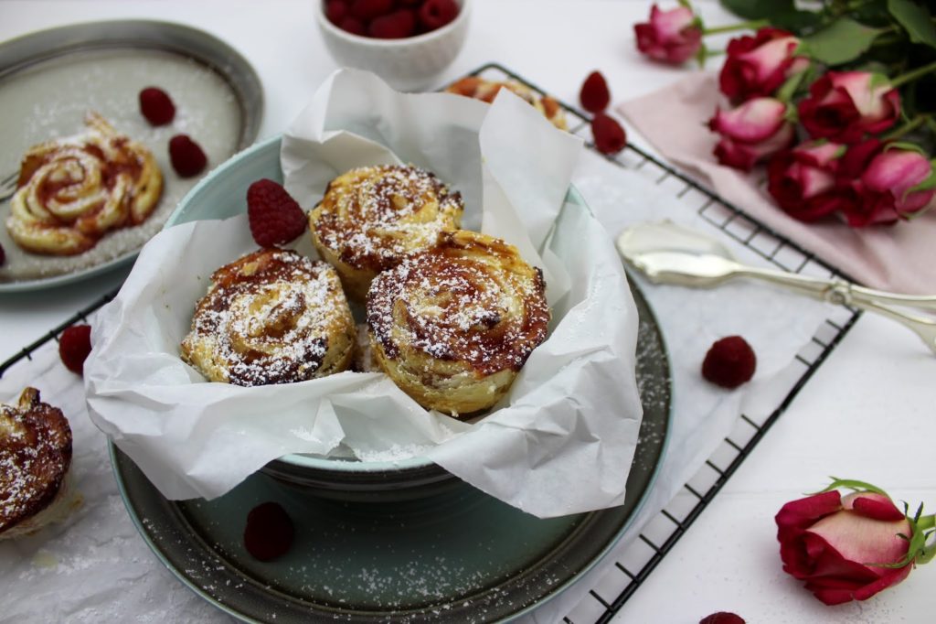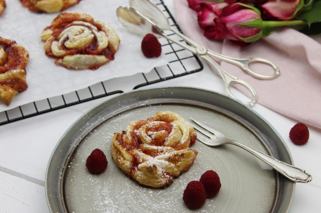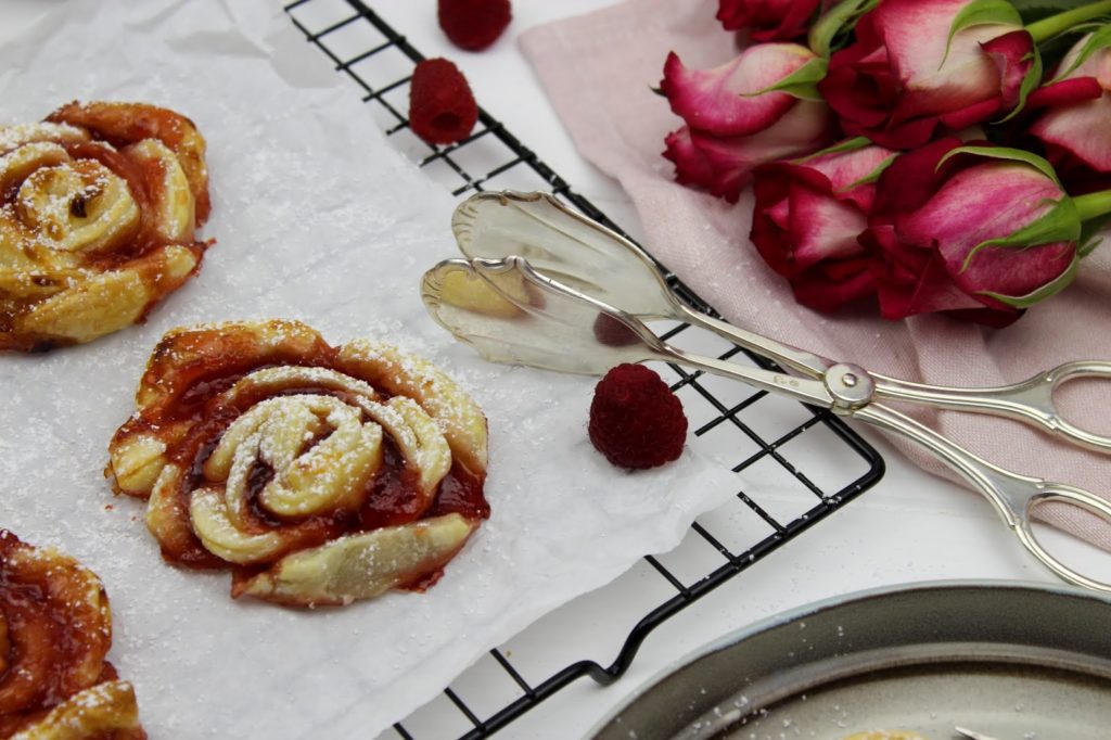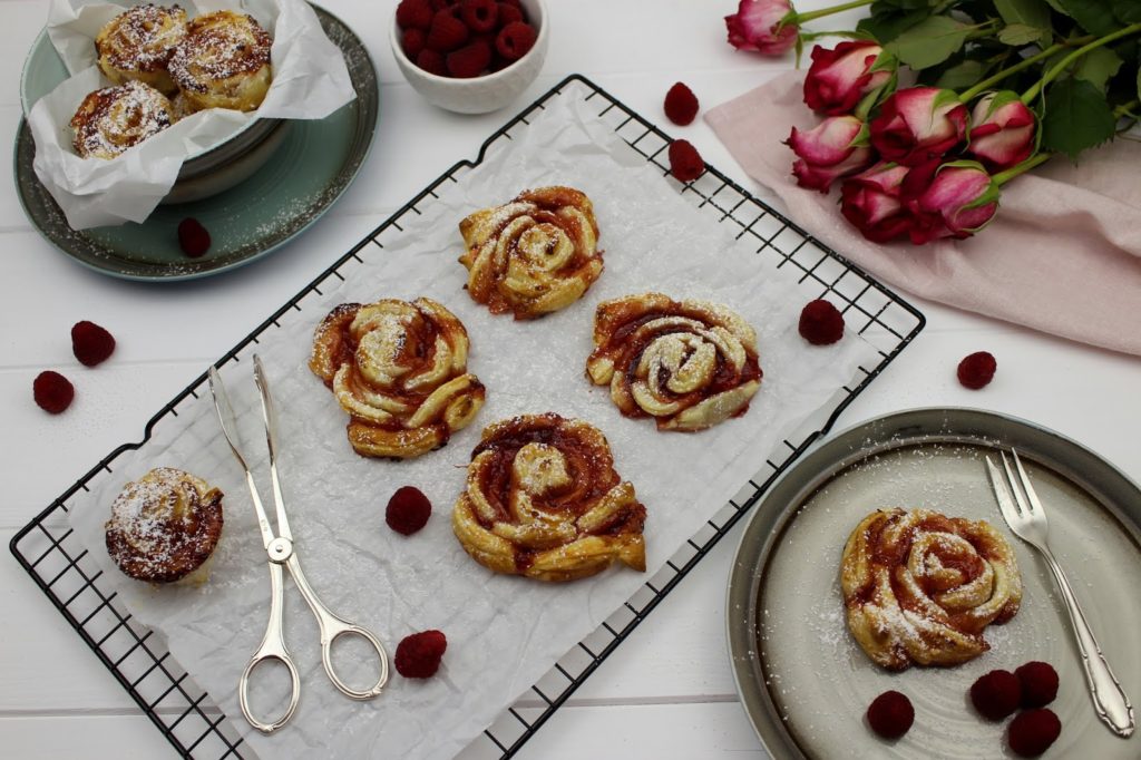 Sehen die Himbeer-Gebäck-Rosen nicht einfach zum Anbeißen aus? Ihr glaubt gar nicht, wie lecker sie gerochen haben. Das Tolle an den Gebäck-Rosen ist, dass sie super schnell gemacht sind und auch nicht ewig backen müssen. Außerdem sind sie ein absoluter Hingucker auf jeder Feier.