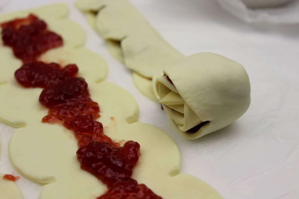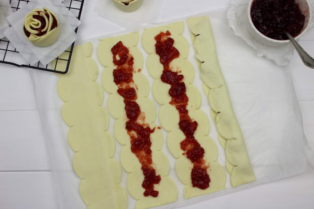 4. Verteilt eure Füllung gleichmäßig in den Teigbahnen. Ich habe selbstgemachte Himbeermarmelade verwendet. 🙂 Hier ist eurer Kreativität keine Grenzen gesetzt. Egal ob süß oder herzhaft. Womit würdet ihr eure Gebäck-Rosen füllen?