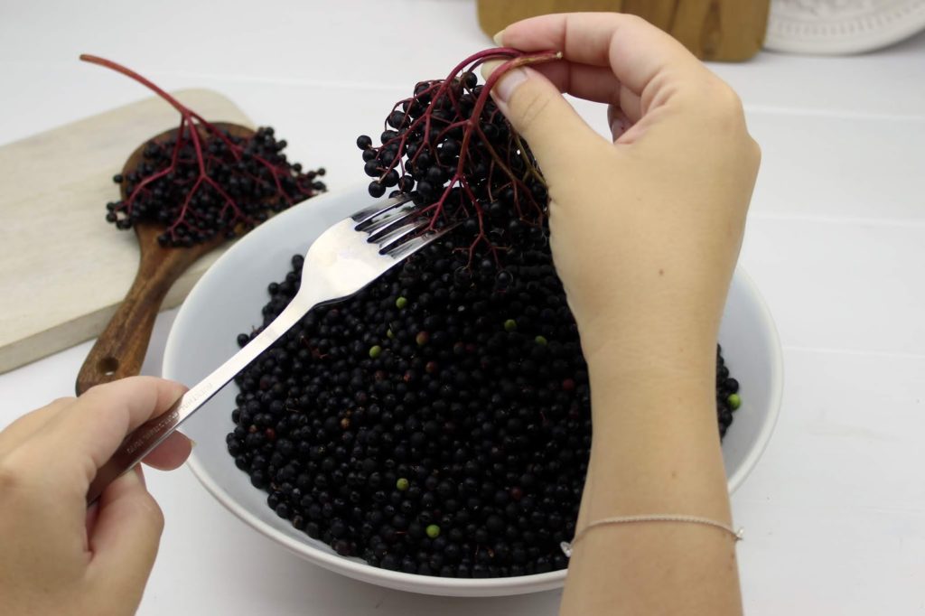 1. Zupft zunächst eure Holunderbeeren vom Stiel ab. Das geht ganz einfach mit einer Gabel. Steckt die Gabel einfach zwischen Stiel und Beere und zieht sie dann vorsichtig ab.