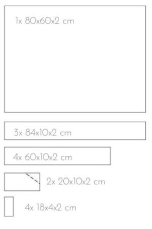- Für das Outdoor Hundebett brauchen wir Bretter und Kanthölzer in folgenden Größen:: 1x 80x60x2 cm, 3x 84x10x2 cm, 4x 60x10x2 cm, 2x 20x10x2 cm und 4x 18x4x2 cm. Ich habe versucht, euch eine kleine Übersicht zu gestalten. Ich hoffe, dass ihr es so gut erkennen könnt.