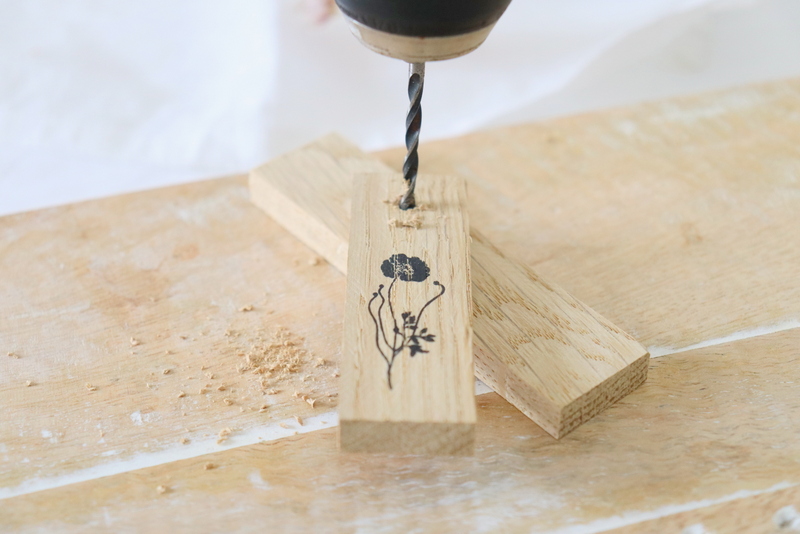 - Danach habe ich mittig ins Holz ein kleines Loch mit meinem Akkubohrer und meinem Holzbohrer gesägt.
