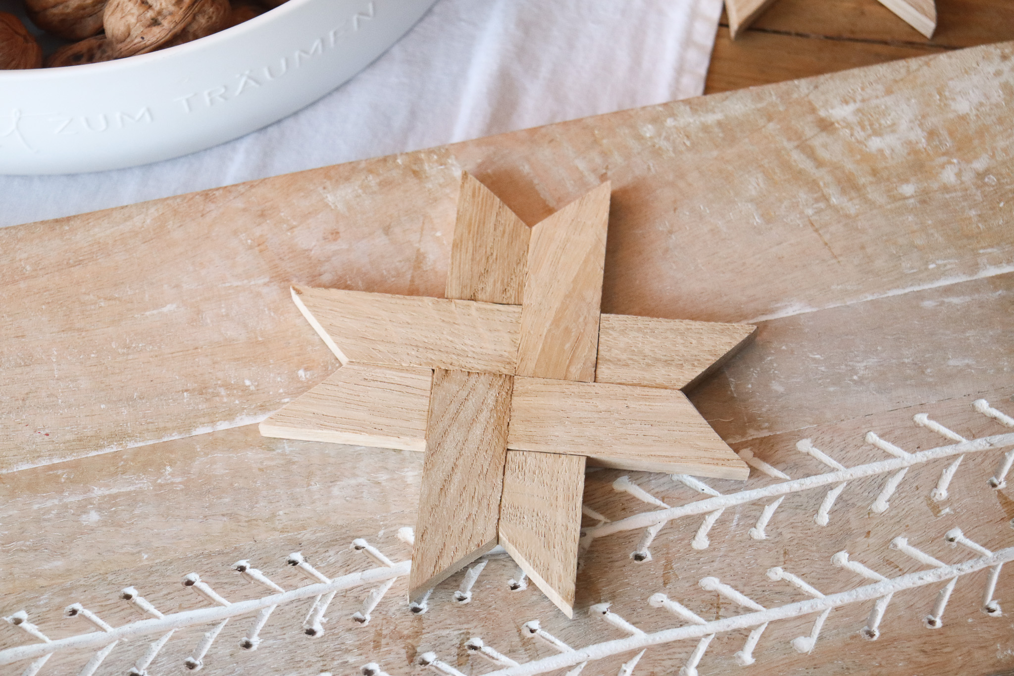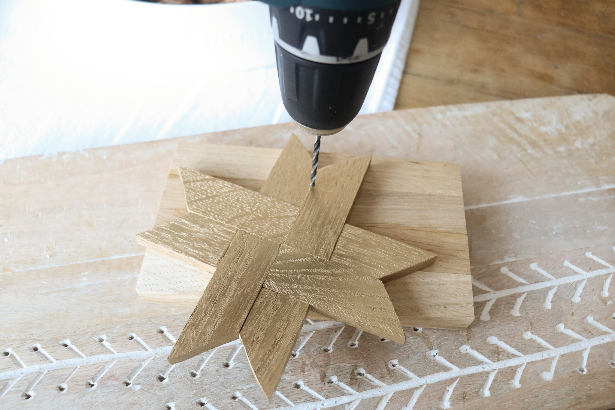 - Wer seine Holzsterne wie ich aufhängen möchte, kann nun ein kleines Loch in eine Zacke des Sterns bohren. Ich habe einen 2mm Holzbohrer verwendet.