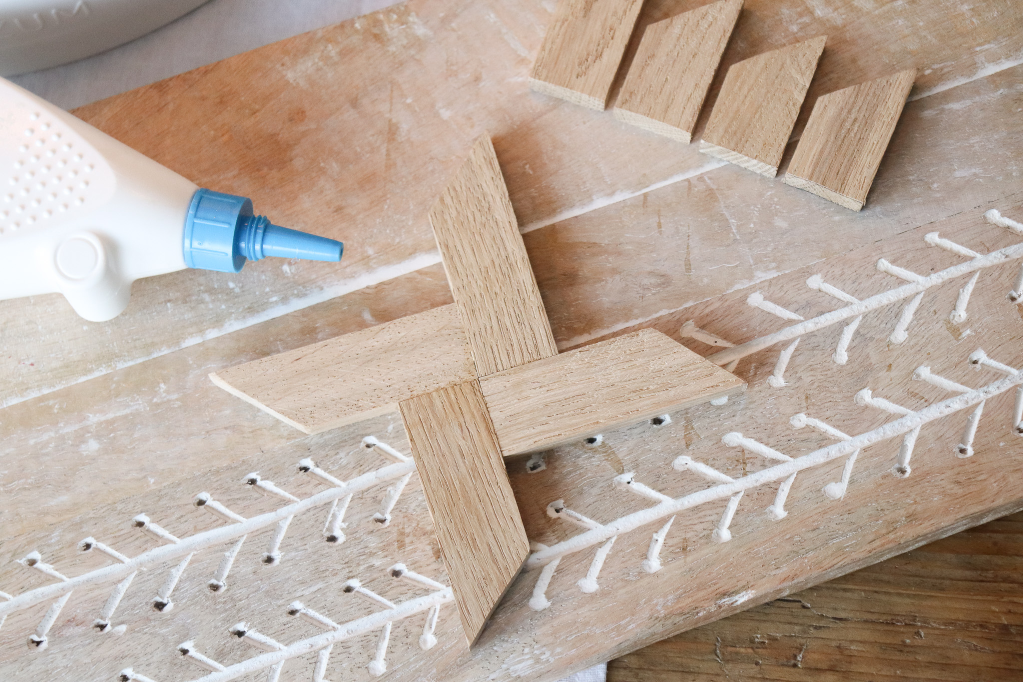 Klebt diese mit Holzleim wie auf dem Bild zusehen aneinander.