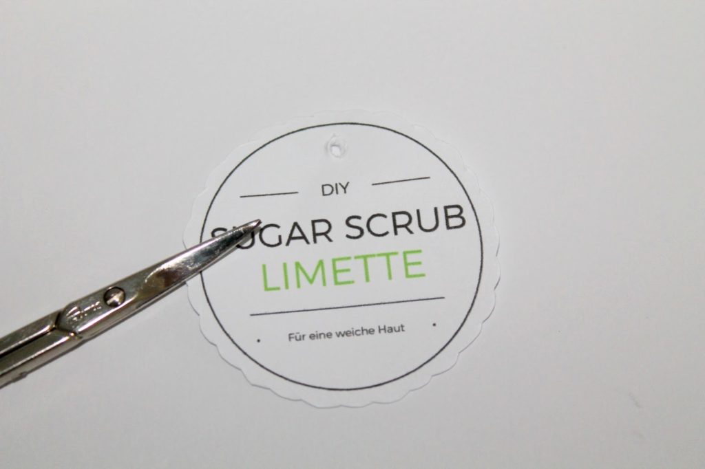 Nun schneidet ihr alles aus und piekst mit der Schere ein kleines Loch in das Etikett. Ihr könnt aber auch einen Zahnstocher verwenden.