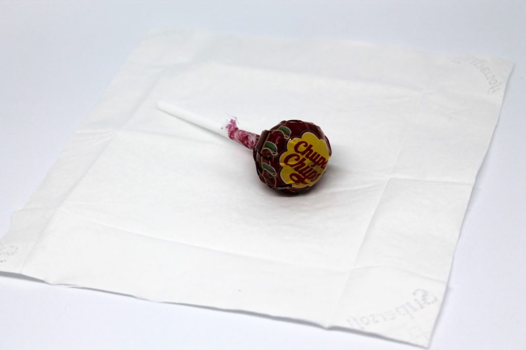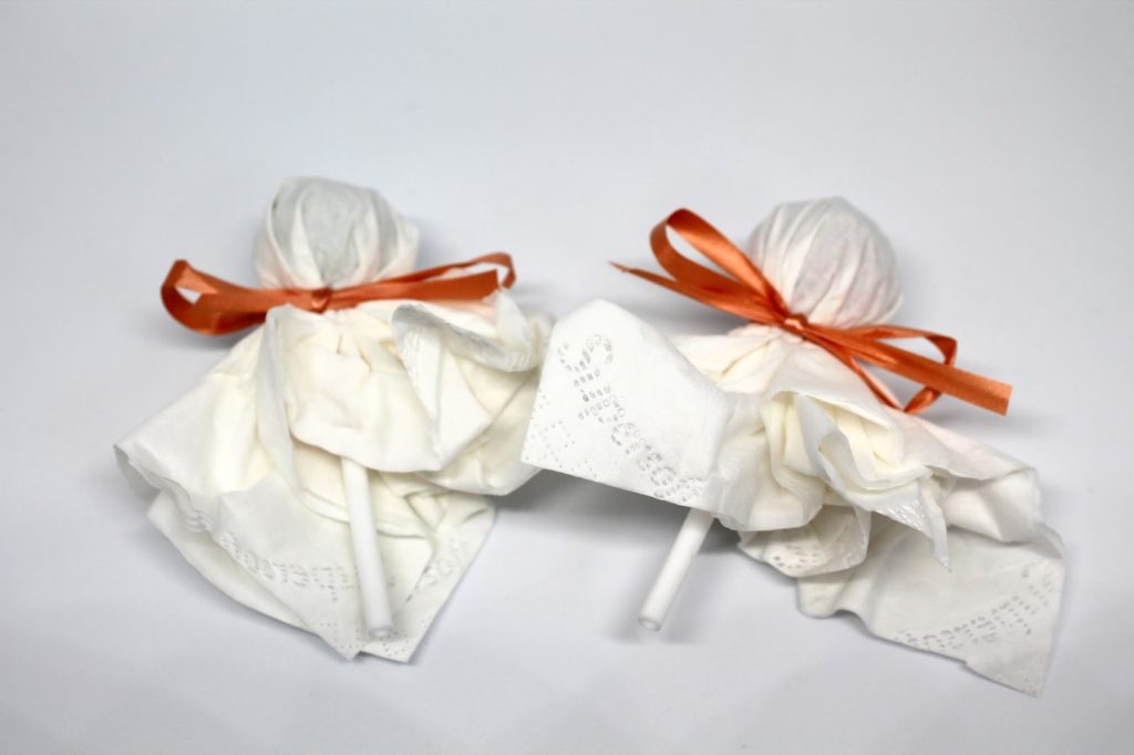Danach habe ich mittig auf das Taschentuch den Lolly gelegt und das Taschentuch mit einem Band festgeknotet.