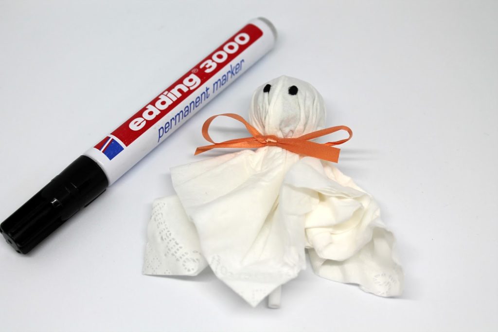 Nun fehlen nur noch die Augen. Diese habe ich mit einem schwarzen Edding auf das Taschentuch gemalt.