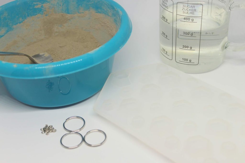 Gebt zuerst etwas von eurem Beton in eine Schüssel, eine kleine Menge reicht für die Schlüsselanhänger aus. Fügt dann ein wenig Wasser hinzu und rührt alles gut durch. Die Masse sollte nicht zu fest sein.
